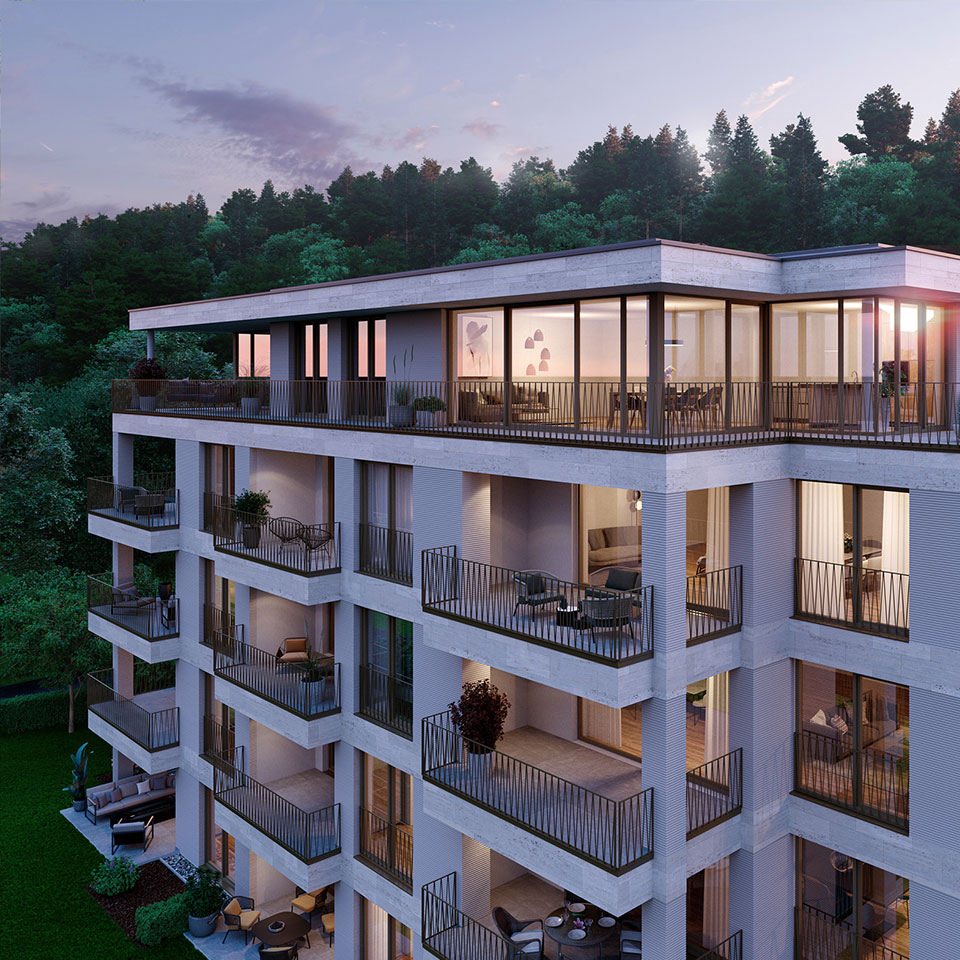 Klar strukturiert. Präzise konturiert. Mit feinen Linien und Proportionen: Lu 36 wird so der noblen Adresse und gehobenen Wohnansprüchen gerecht. Die Konzeption greift die idyllische Situierung auf, bezieht die nähere und weitere Umgebung durch präzise inszenierte Aussichten mit ein und beschert einigen Wohnungen sogar Münsterblick.